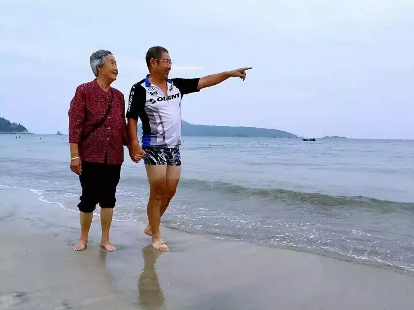 陪自己的母亲去看海。
