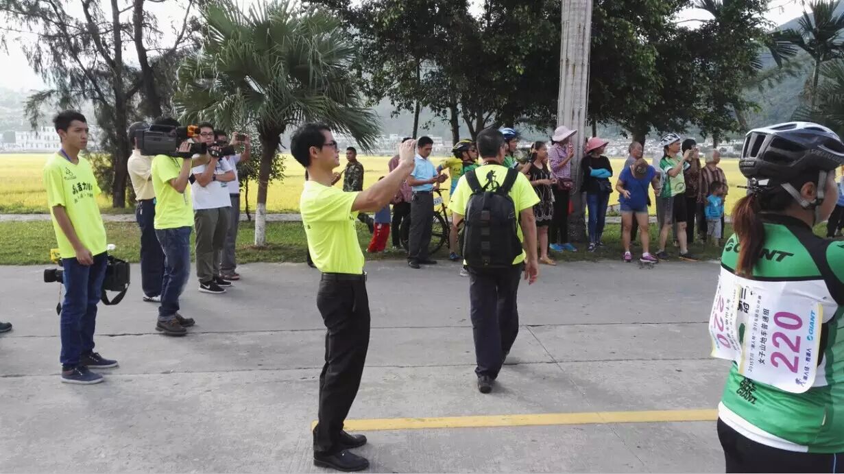 在终点的现场,各地区捷安特掌门人为自己俱乐部的车友加油。(依次中山小榄店兰姐、中山市老捷店廖顺贤、顺德区大良店黄多)