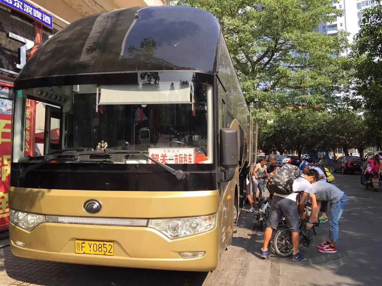 车友间相互帮忙,将自行车放入到大巴行李箱内。